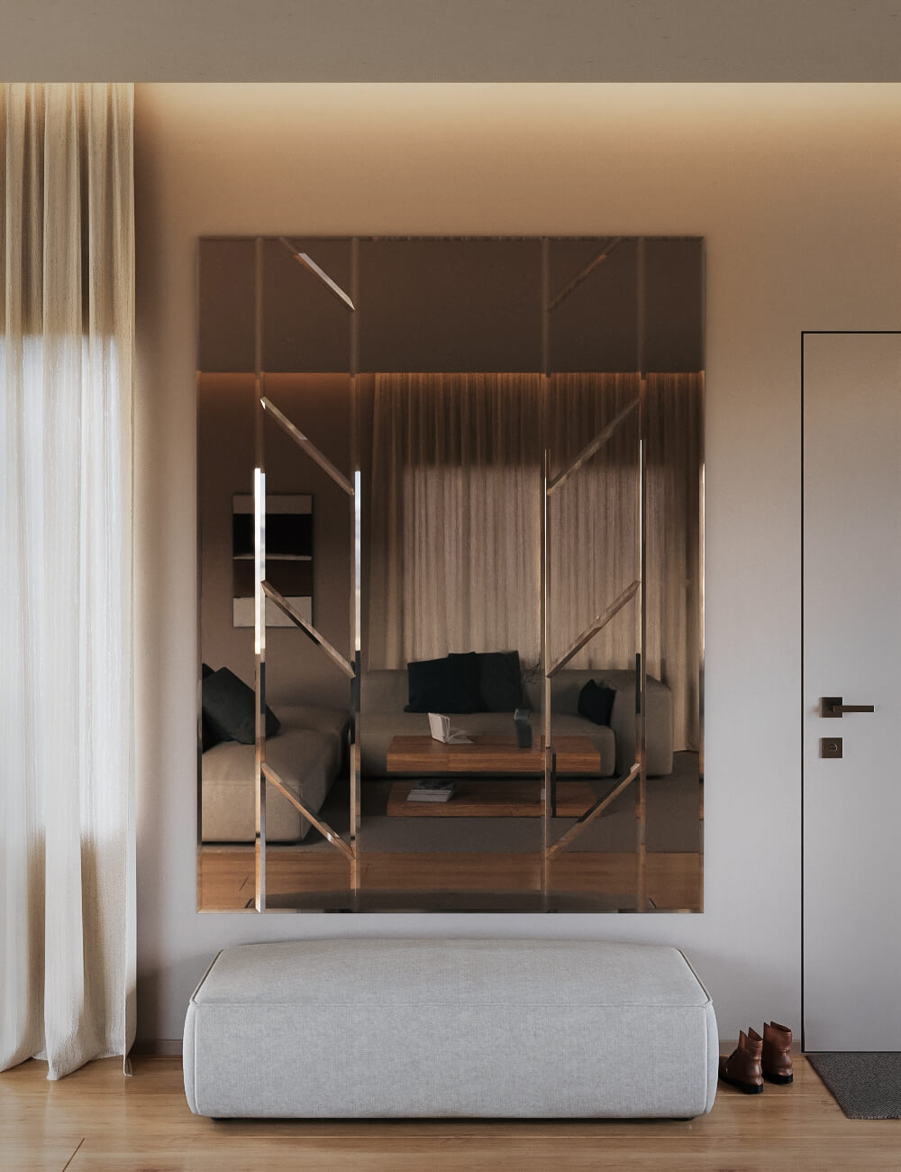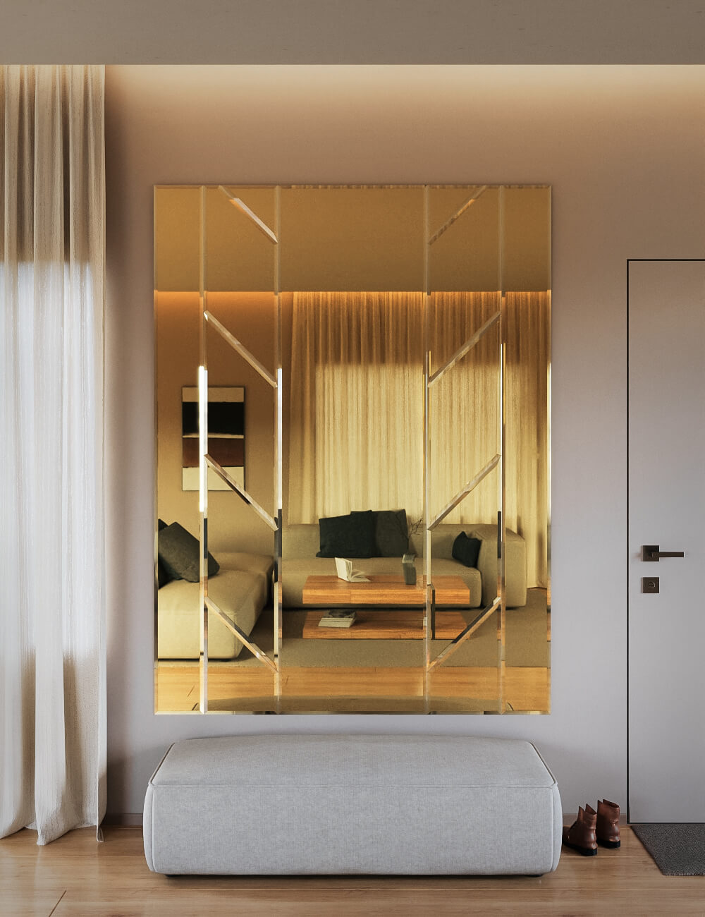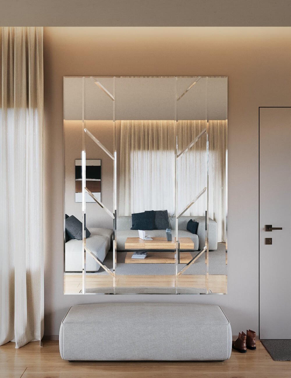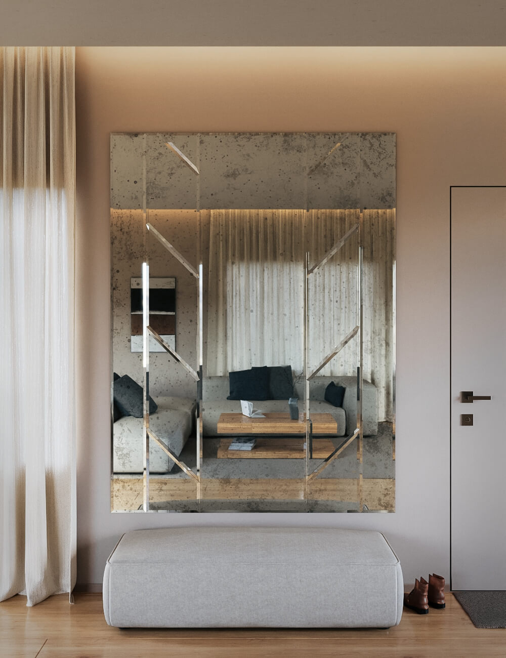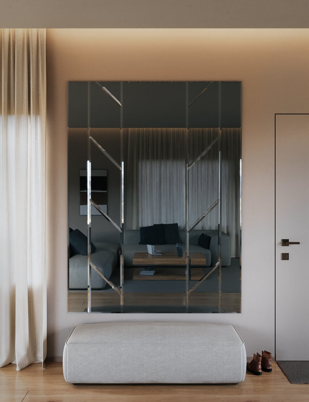 Зеркальное панно – яркий и действенный прием в интерьере, чтобы выделить его среди остальных. Поскольку на обработанных краях из-за дисперсии свет переливается цветами радуги, фацет на зеркальном пано добавит помещению красивых оттенков.